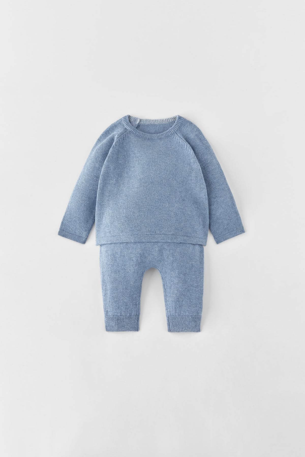 Two-piece set. Round neck sweater with long sleeves. Button fastening at the back. Trousers featuring an elastic waistband with front pouch pocket. Ribbed trims.