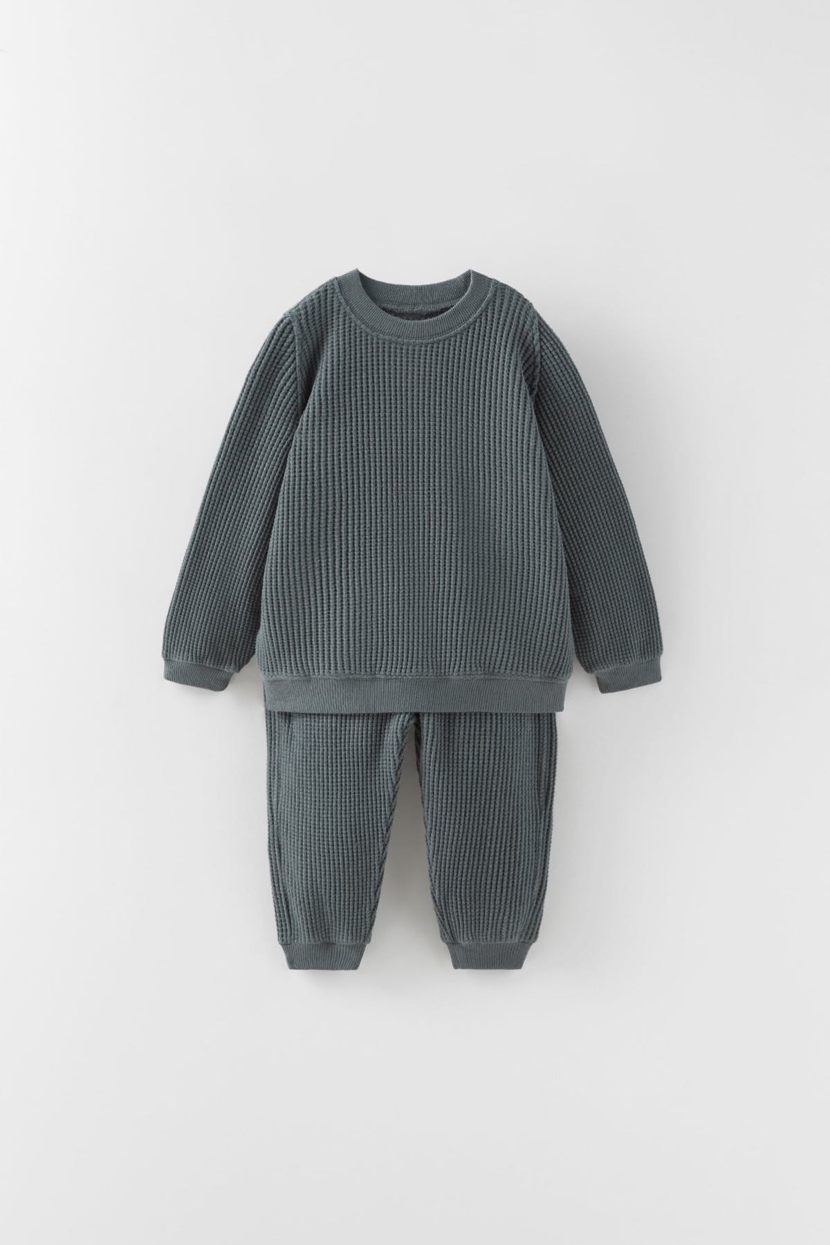 Two-piece set. Waffle-textured sweatshirt with a round neckline and long sleeves. Trousers with an elastic waistband and cuffed hems. Ribbed trims.